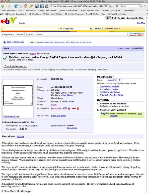 It should also be noted that this item bas inspired much creative output of varying quality. The buyer will receive a hand-signed certificate of ownership, pictured above.