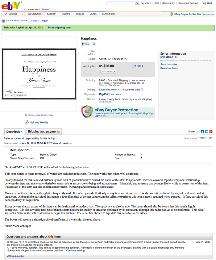 Money cannot buy this item, though it is frequently sold. It is often gained effortlessly at any time and at no cost. It is also sometimes found by way of hard work and at great cost. Although the pursuit of this item is a founding ideal of certain cultures, in the seller's experience this item is rarely acquired when pursued. In fact, pursuit of this item can delay its acquisition.