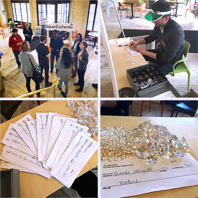 Values Exchange Trading Floor is a free alternate reality simulation prompting reflection and playful dialogue on the subjectivities, logic and absurdities of value, commodification, and transactional cultures. In a musical, open-ended, game-like scenario that’s open to the public, Brokers show participants how to assign “exchange units” to what they value using Values Notes. Participants “play” these “notes” by ringing bells and bargaining for values on an open market floor, accumulating and distributing currency. At times, participants must respond to interventions by Brokers and other external forces.